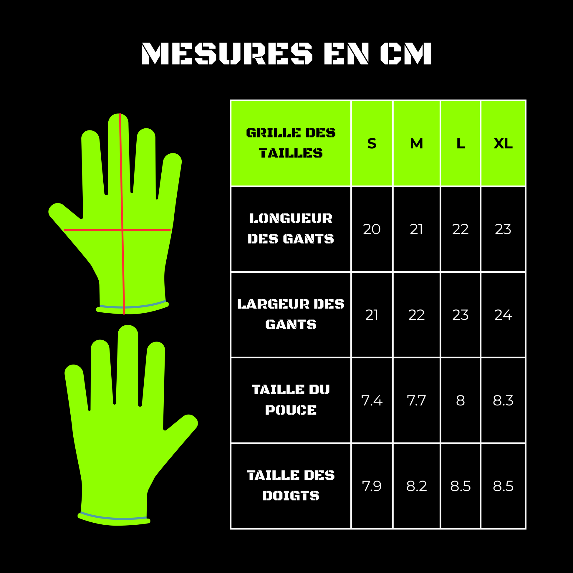 Consulte la grille de tailles pour choisir la coupe idéale selon la longueur, la largeur, et la taille de tes doigts/pouce.